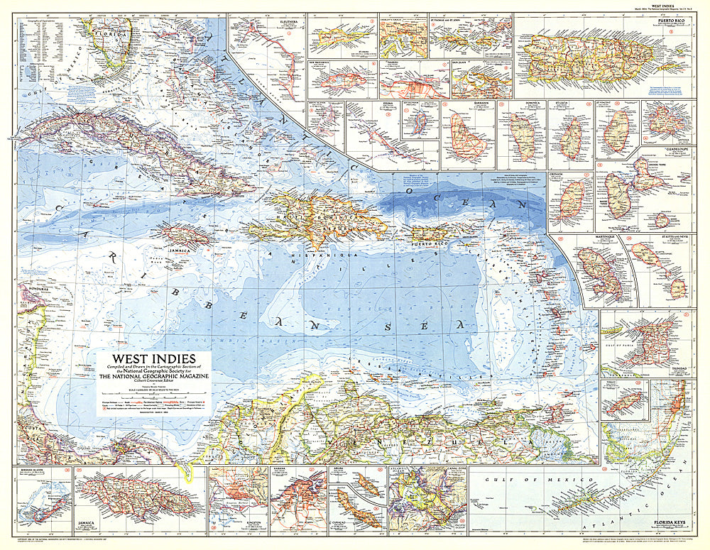 - This colorful map of the West Indies contains thirty inset maps providing spectacular detail of the many islands in the Caribbean. Published in March 1954 with two articles, "Jamaica - Hub of the Caribbean" and "Night Life in the Gulf Stream."