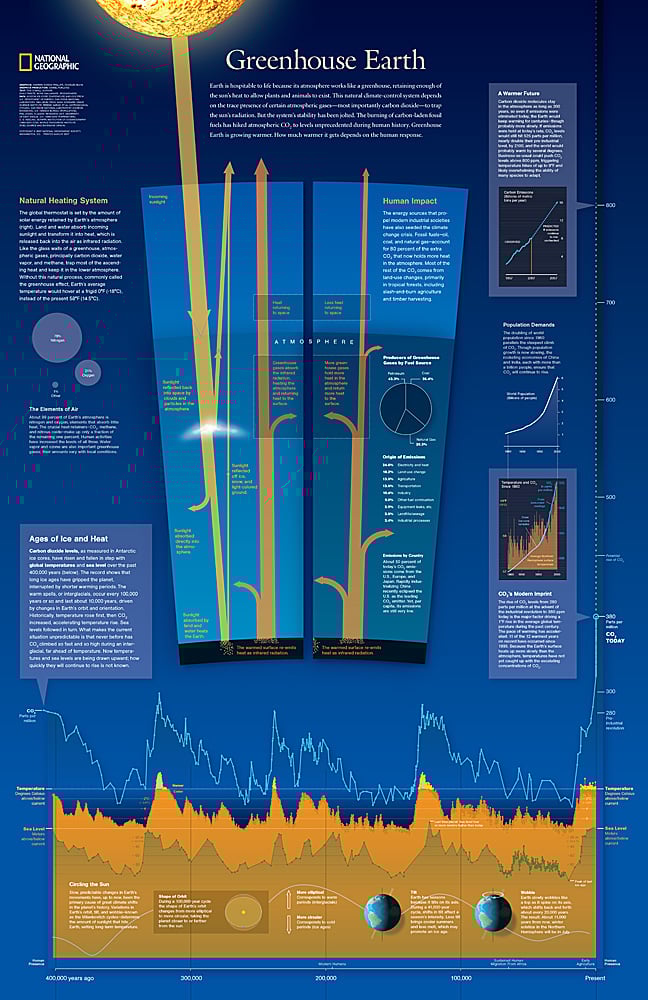- Published in October 2007 as half of a two-piece set with "Changing Climate," this revealing poster explains how the Earth's atmosphere acts as a greenhouse and how carbon emissions raise the planet's surface temperature. Graphs and charts reveal the origin of emissions, predicted future carbon emission levels, and the warming cycles the planet has experienced in its history.