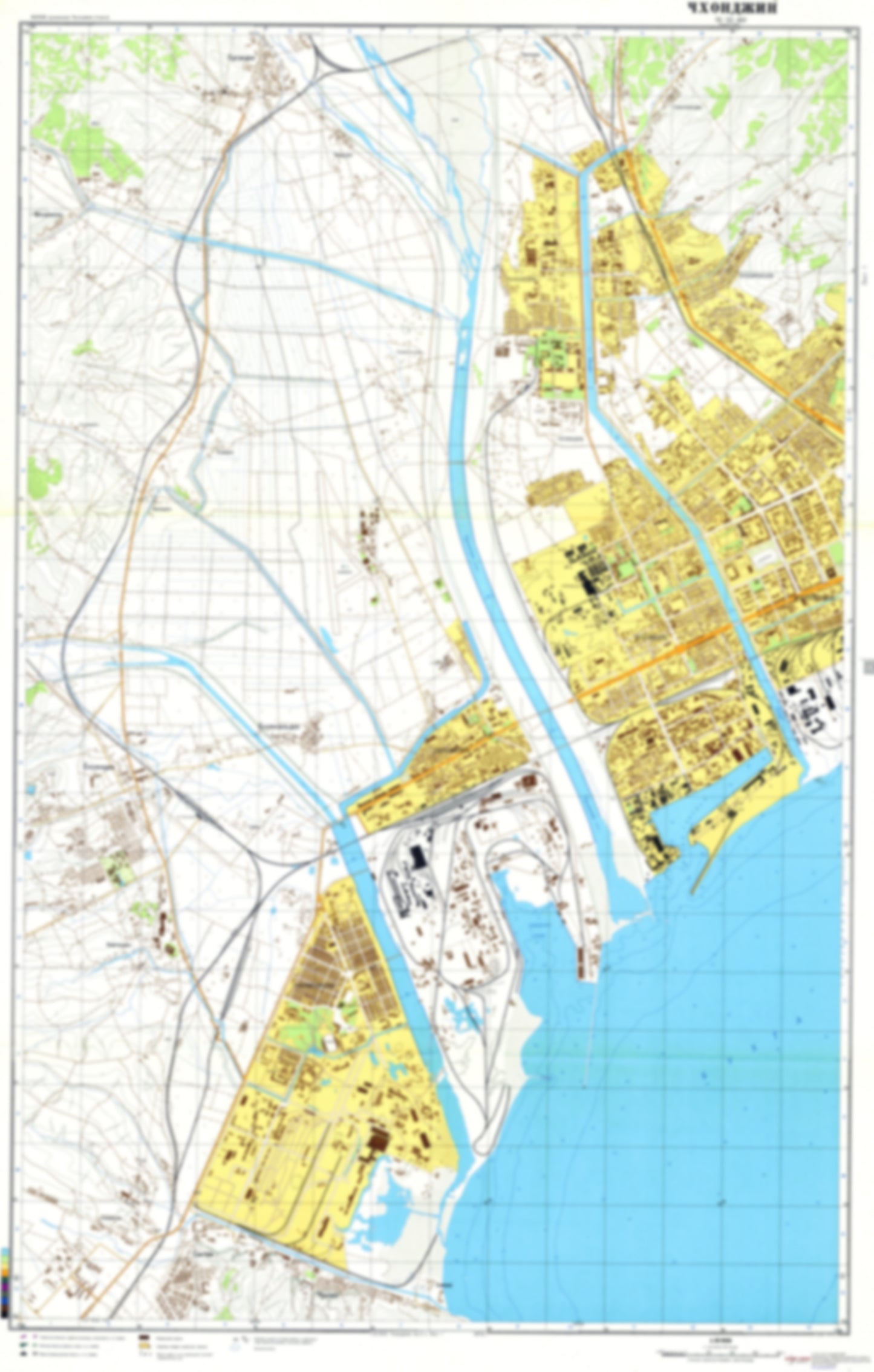 - During the Cold War and before easy access to high-resolution satellite imagery, The Soviet Military was secretly mapping the entire world. These aesthetically striking maps are beautiful down to the last detail and fantastic wall art and until now, have rarely been viewed or available to outsiders. This series has been covered by Wired Magazine and Greg Miller in his book, "All Over the Map: A Cartographic Odyssey". This map is part of the Soviet City Plans Series presented by East View, which has the largest collection of Soviet Military City Plans in the world. The Soviet Military City Plan(s) of Chongjin 1 (North Korea) is one in a series of highly detailed topographic city maps developed by the USSR Ministry of Defense during the Cold War era. These collectable, high resolution print-on-demand editions are delivered on premium, acid-free, matte paper. This item is sheet number 1 in a set of 2 sheet(s) for Chongjin Populated Places: Ch'Angp'yong-dong, Ch'ongam-dong, Ch'ongnam-dong, Chajak-tong, Chech'ol-tong, Chungp'yong-dong, Hoeam-dong, In'gol-tong, Kangdogi, Kangdok-tong, Kugangdok, Makson-dong, Mangdok-tong, Namdong-ch'on, Namsok, P'ohang-guyok, Panjuk-tong, Puktong-ch'on, Sangdok-ch'on, So-hang, Sohang-dong, Soman, Subuk-tong, Sunam, Sunam-guyok, Tohyang-dong, Tokch'on-dong, Toktan, Tut'oul-gol, Yombun, Yonggang-dong, Yonghyang-dong, Yup'An Water Bodies: Nam-p'o